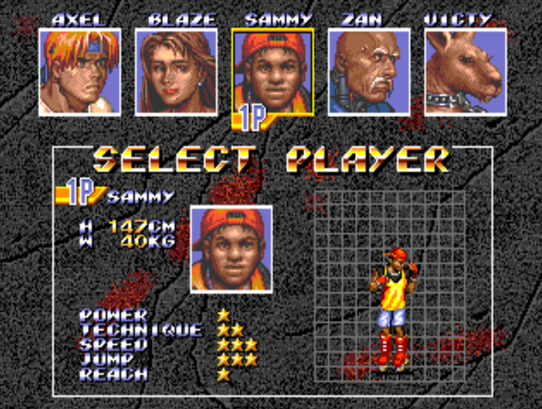 역시 시리즈의 주인공 중 하나로, 베어 더 낙클의 여성 퍼슨 스트리트 파이터입니다. 경찰 출신이며, 훈련된 무술로 적들을 상대합니다.
