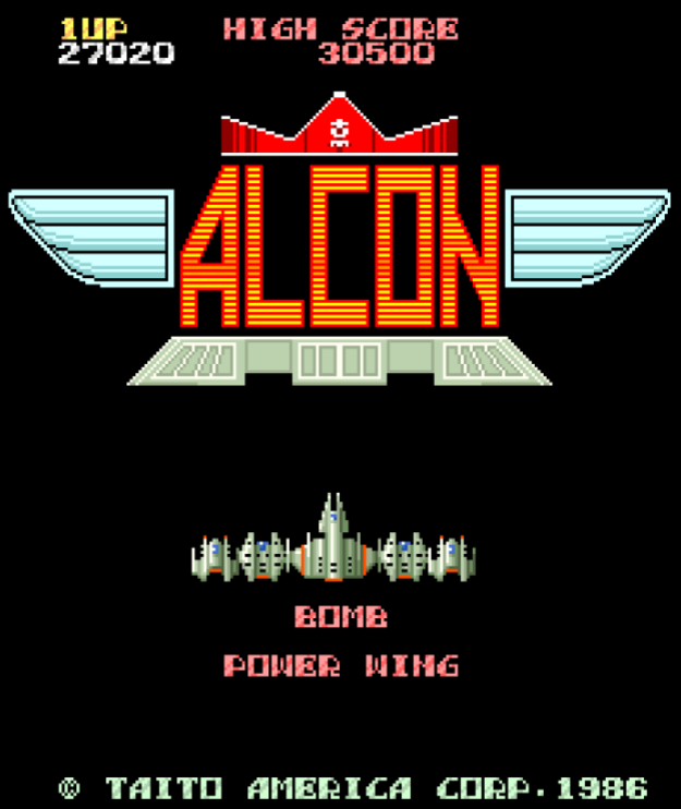 알콘은 8비트 시대의 그래픽과 사운드를 사용하며, 당시의 아케이드 게임의 특징을 보여줍니다.