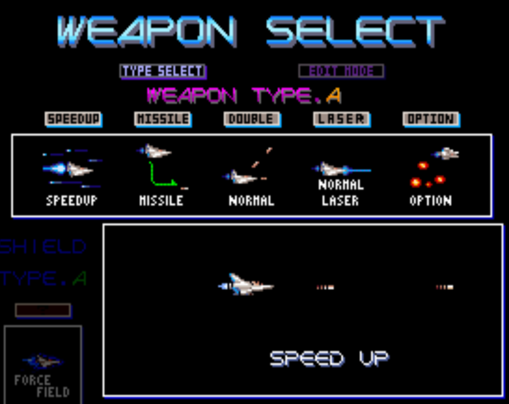 다양한 무기 및 파워업: 게임에서는 레이저, 미사일, 더블 캐논 등 다양한 무기가 있습니다. 플레이어는 적을 격파하고 파워업 아이템을 획득하여 우주선을 강화할 수 있습니다.